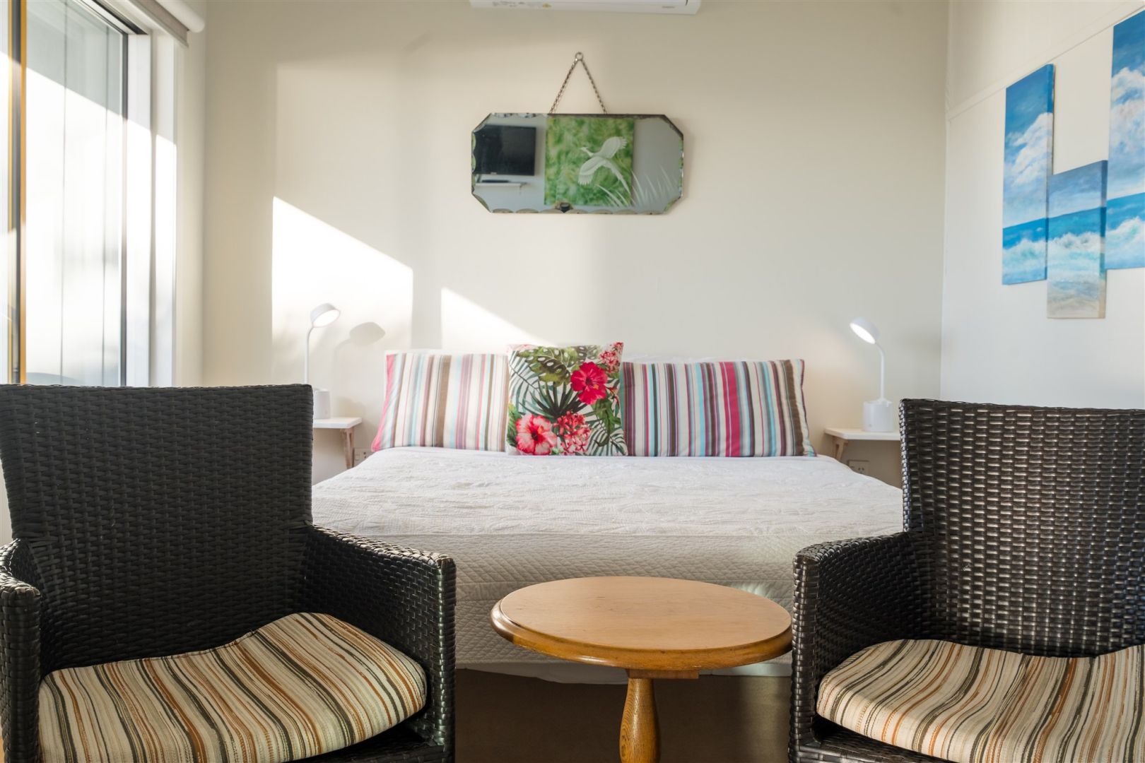 Studio Apartments:- a queen bed and a single, with a kitchenette and bathroom and sleep up to 3. Great for singles or couples.