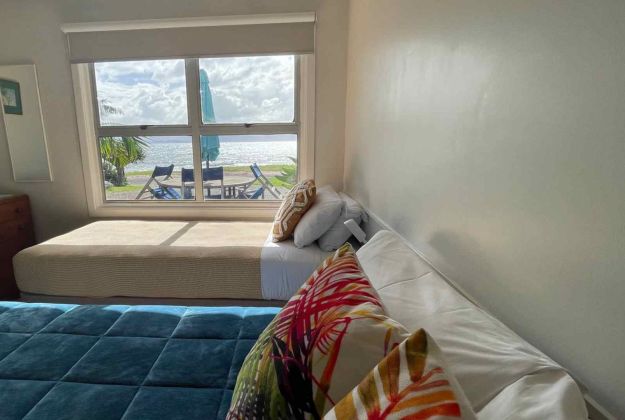 The PAUA Family one bedroom Apartment is North facing, on the ground floor with a queen bed and 3 singles. With the fully equipped kitchen with oven, microwave and fridge, and the air conditioning and Television You will have a comfortable beachfront holiday. The bathroom has large tiled modern shower, toilet and basin. Open plan flow onto ground floor deck with outdoor table and chairs and deck chairs for relaxing in. |