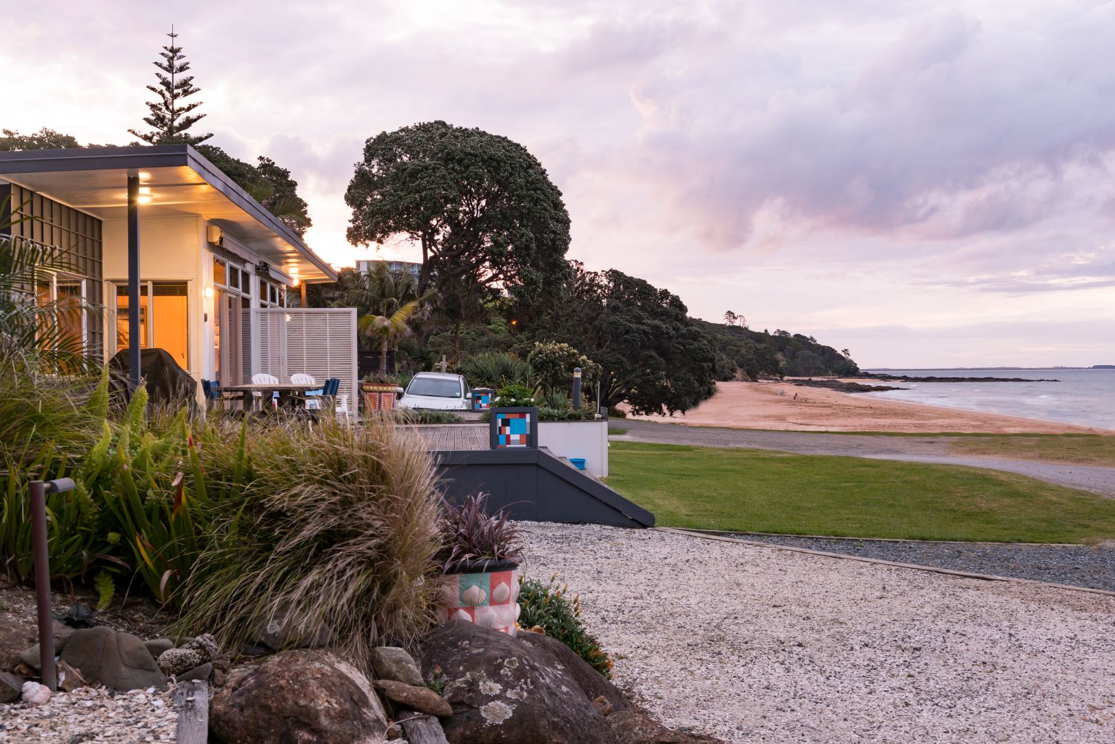 very enjoyable will go again for sure Location was great just walk out of your room and you are on the beach Quintessential Kiwi bach but had been renovated to a very high standard with retro furniture some of it from the 60's tastefully done new bathroom was great, super big shower